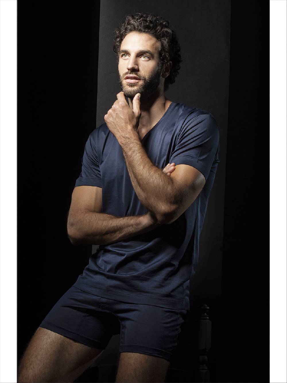 Julipet Maglietta blu scollo a v in jersey di puro cotone mercerizzato e gasato