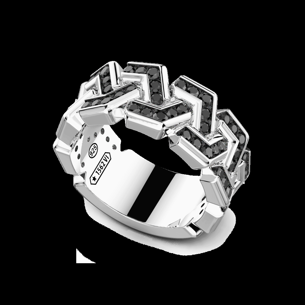 Anello Zancan a fascia in argento. L'anello a maglia curb è tempestato di pietre naturali nere o bianche. L'anello fa parte della collezione Cosmopolitan Luxury la divisione premium della nostra collezione generale Cosmopolitan, ispirata dal design delle metropoli internazionali. Questo anello è completamente realizzato a mano in Italia ed ha un peso di 13.10gr.
