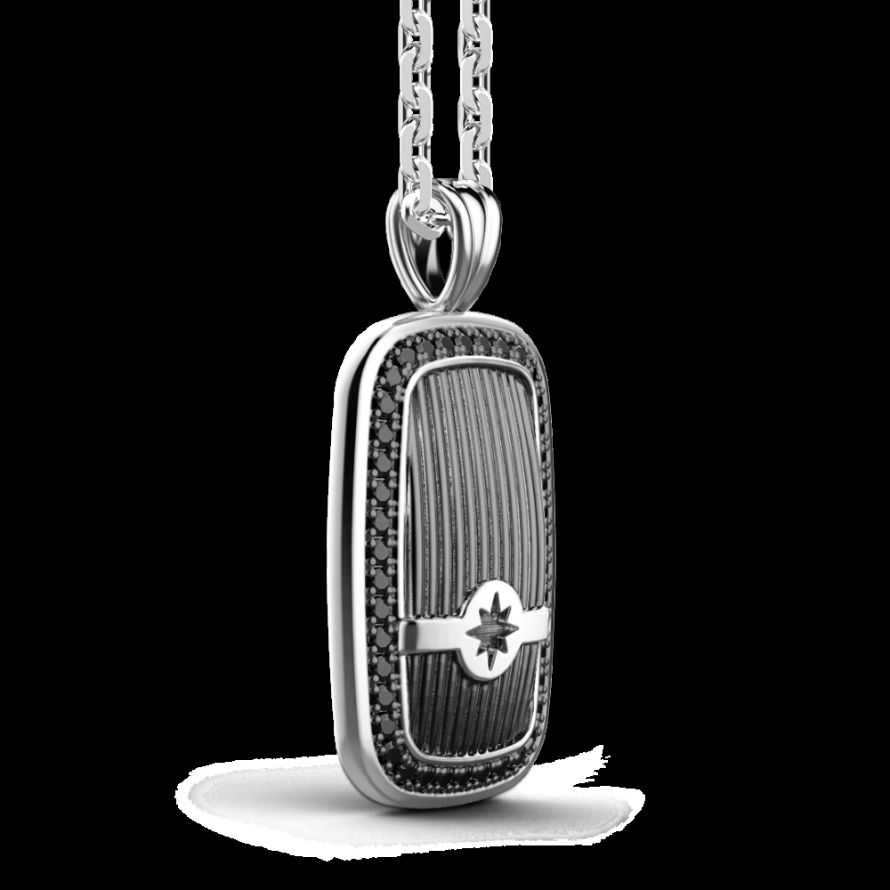 Collana Zancan in argento 925. Il pendente a targa, tempestato di spinelli neri lungo i bordi. La parte centrela è caratterizzata de striature nere in contrasto unito ad un elemento di design lucido che riporta l'iconica rosa dei venti Zancan nel centro. La collana fa parte della collezione Cosmopolitan che si ispira alla vita metropolitana, frenetica ed al passo con i tempi. Il gioiello è completamente realizzato a mano in Italia. La collana ha un peso di 19.00gr ed una misura standard di 50cm.